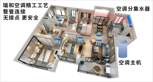 空調管道屬于隱蔽工程,水管道的安全性非常重要,瑞和采用分水器安裝工藝,管道整根連接無接頭,徹底消除管道接頭漏水隱患。